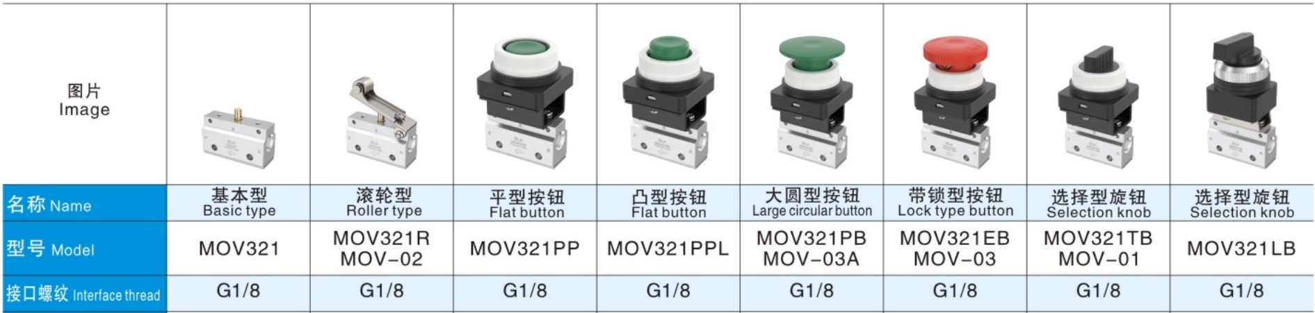 Η βαλβίδα της σειράς MOV321 μπορεί να ελέγχει τους κυλίνδρους μονής δράσης με διαμέτρους διασύνδεσης των Μ5 και G1/8. Το P αντιπροσωπεύει την είσοδο, το Α για την έξοδο και η θύρα εξάτμισης βρίσκεται στη ράβδο ώθησης.