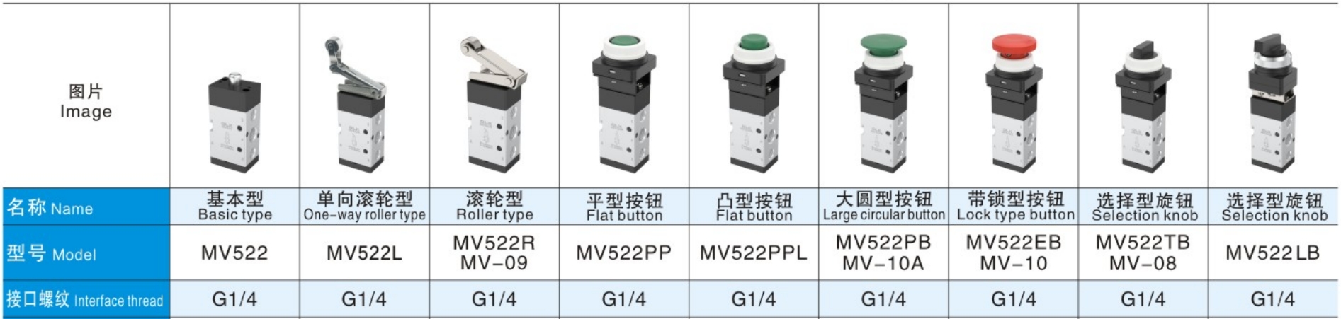 Το MV522 Mechanical Button Valve Valve είναι G1/4, με μια πίεση να κυμαίνεται 0-0,8MPa και δεν απαιτεί λίπανση. Εύκολη διατήρηση και εξυπηρέτηση, μείωση του χρόνου διακοπής και συντήρησης του κόστους.