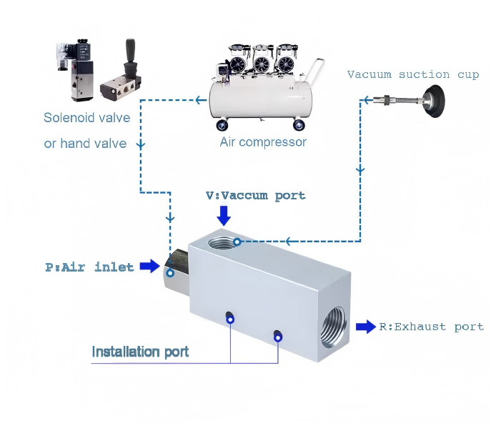 αντλίες κενού και γεννήτριες κενού. Η αντλία κενού είναι μια μηχανική συσκευή που δημιουργεί αρνητική πίεση στη θύρα αναρρόφησης και επιτρέπει στη θύρα εξαγωγής να διέρχεται απευθείας από την ατμόσφαιρα, με υψηλή αναλογία πίεσης και στα δύο άκρα για την εξαγωγή αερίου. Μια γεννήτρια κενού είναι ένα πνευματικό εξάρτημα που χρησιμοποιεί τη ροή του πεπιεσμένου αέρα για να σχηματίσει έναν ορισμένο βαθμό κενού. Σε σύγκριση με μια αντλία κενού, έχει απλή δομή, μικρό όγκο, μικρό βάρος, χαμηλή τιμή, βολική εγκατάσταση, εύκολη σύνθεση με εξαρτήματα στήριξης, γρήγορη παραγωγή και απελευθέρωση κενού και είναι κατάλληλη για διακοπτόμενη εργασία με χαμηλό ρυθμό ροής, κατάλληλη για διάσπαρτη χρήση