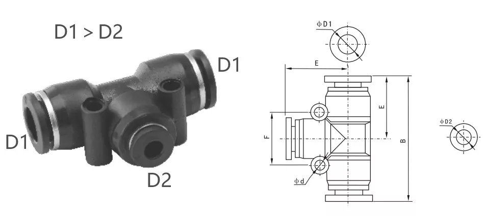 PE FITTING (Equal Tee Union): Και οι τρεις σωλήνες έχουν την ίδια εξωτερική διάμετρο, κατάλληλη για τη σύνδεση τριών πνευματικών σωλήνων του ίδιου μεγέθους.