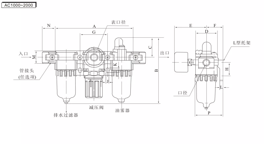 AF (Φίλτρο αέρα) + AR (Βαλβίδα ρύθμισης πίεσης) + AL (λιπαντής ομίχλης λαδιού) = Τριπλή μονάδα AC