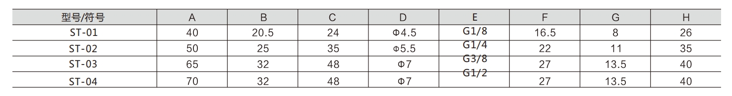 Εάν τα εξαρτήματα του σωλήνα αέρα δεν έχουν επιλεγεί σωστά, προκαλώντας την πρόσληψη ή εξάτμιση αέρα σε μια θύρα να είναι πολύ μικρή, ο πυρήνας της βαλβίδας μπορεί να μην μετατοπιστεί πλήρως, οδηγώντας σε όλες τις θύρες που συνδέονται. Αυτό πρέπει να αποφευχθεί. ST-01: G1/8; ST-02: G1/4; ST-03: G3/8; ST-04: G1/2